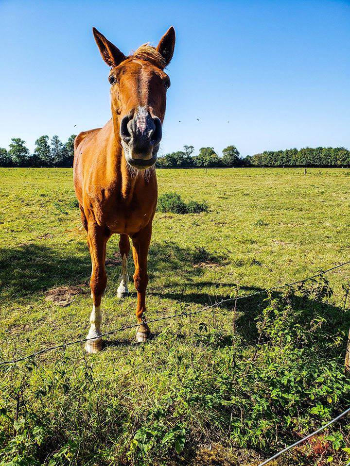 Somewhere on the side of the road in France — where my ex-husband and ex-father-in-law were busy daring each other to touch an electric fence (because apparently adulthood is optional), and I was over here making friends with a very handsome horse.