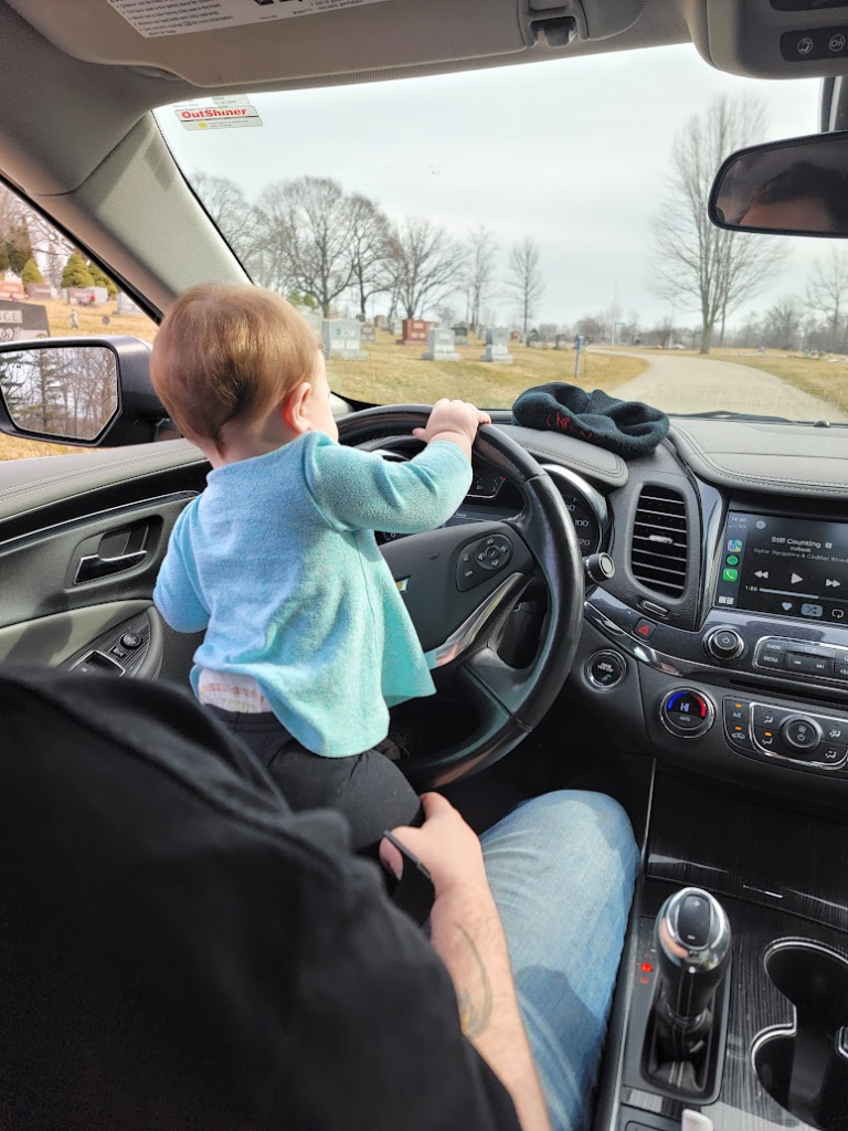 Evie learning how to steer for the first time—hands gripping the wheel of Dave’s car, eyes locked in, like the world depended on it.